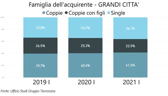 Prendendo in considerazione solo le grandi città italiane la percentuale di acquirenti single sale al 36,1%, anche in questo caso con numeri in crescita rispetto agli stessi semestri degli anni precedenti.